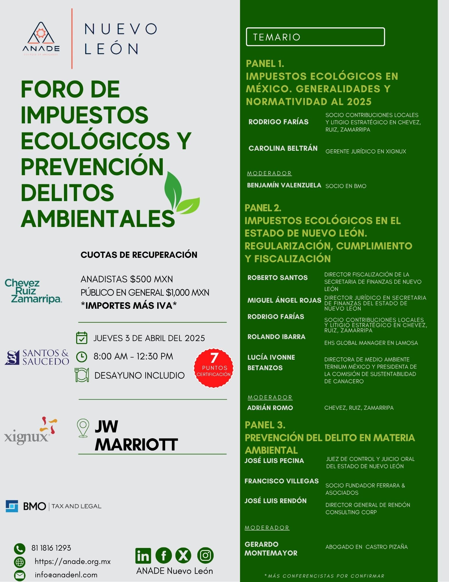 Congreso Nacional Fiscal ANADE 2025July 7, 2025Foro FiscalJuly 7, 2025 Published by anade_a483q6 on July 7, 2025 Categories Tags Foro de Impuestos Ecológicos y Prevención de Delitos Ambientales 96 96 people viewed this event. Register for event To register for this event email your details to i.ramirez587@gmail.com Register using webmail: Gmail / AOL / Yahoo / Outlook Date And Time 2025-04-06 @ 09:00 AM to 2025-04-06 @ 11:00 AM Location - Event Types Taller Event Category Past Share With Friends Facebook Twitter Linkedin Xing Pinterest Share0 anade_a483q6